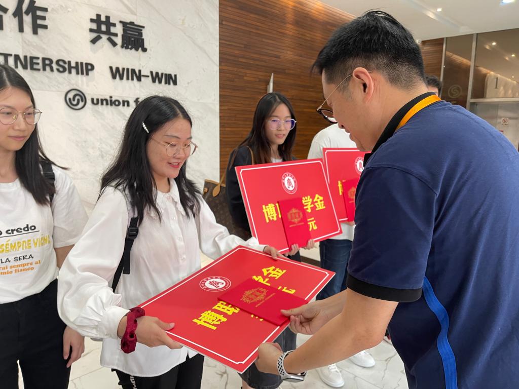 胡振华院长宣读了“博联奖学金”的获奖名单,共11名同学获奖。随后,两位校友逐一为获奖同学颁奖。
