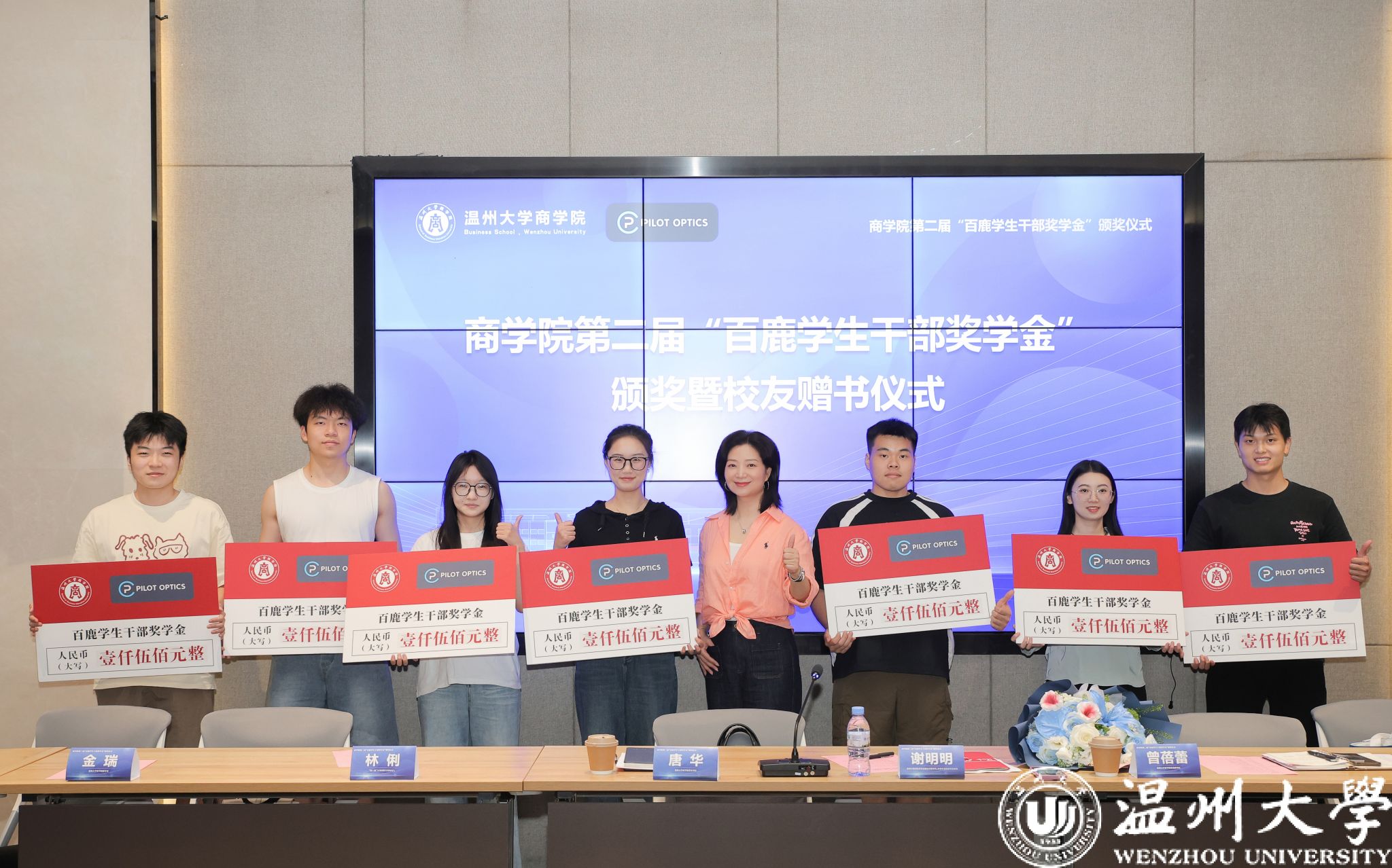 2025年6月23日,成人电影 第二届“百鹿学生干部奖学金”颁奖仪式在南校区校友之家一楼会议室隆重举行。“百鹿学生干部奖学金”设立者、温州百鹿国际贸易有限公司董事长、97届外贸经济专业谢明明校友,成人电影 党委书记唐华、党委副书记曾蓓蕾、国贸专业负责人林俐等学院教师,与第二届“百鹿学生干部奖学金”获得者共同参加了颁奖仪式。
