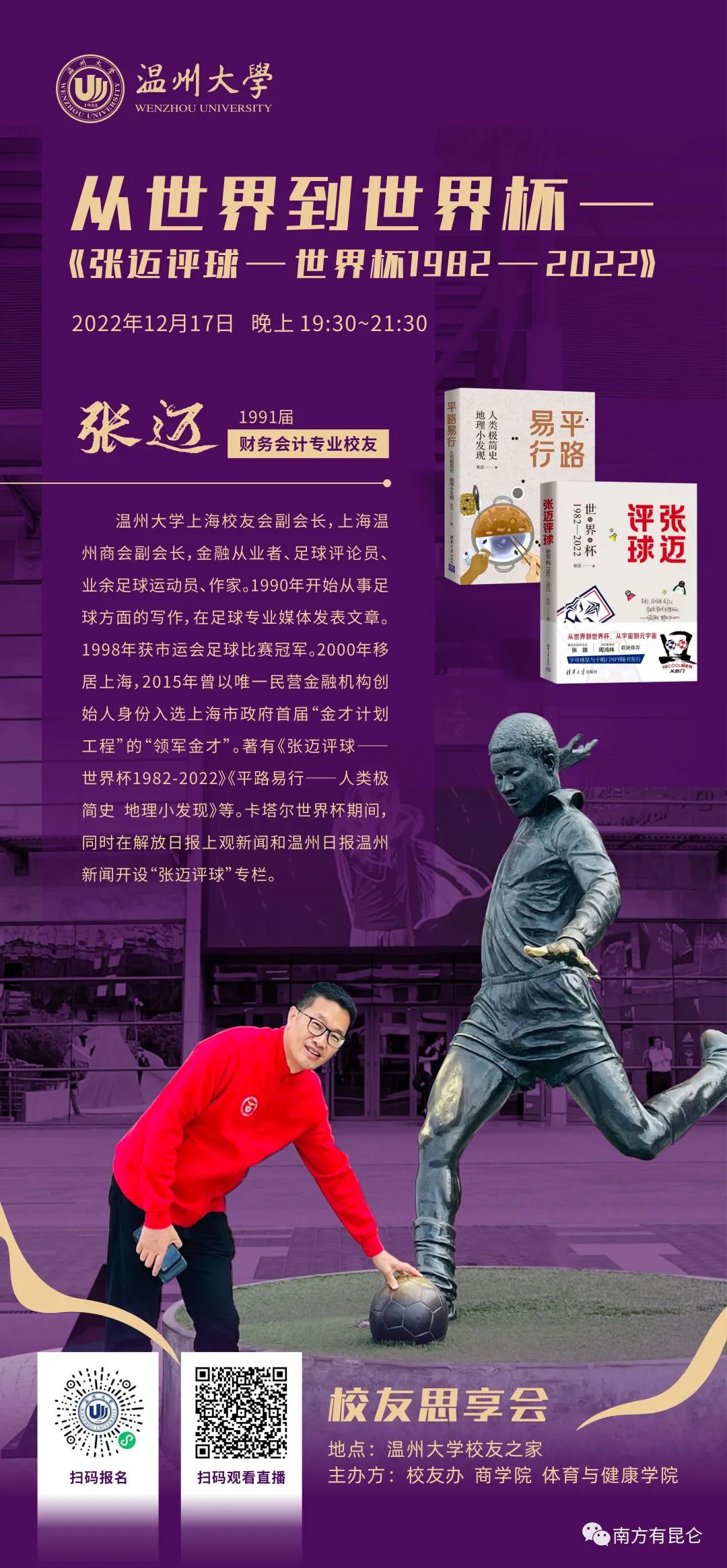 5月6日,我辗转欧洲和国内多地回到母校,回到温大校友之家。我上一次回“家”是140天前卡塔尔世界杯决赛前夜,在这里和全球近6000名校友分享了从世界到世界杯的体会与感悟,我甚至收到了北美校友也是中学同学妈妈的问候,这让我激动不已。Web3.0时代的温大将时间和地点全部虚化了,时空流中的校友之家通过一次线上线下联动的思享会把我的大学变成了一种元宇宙里的状态。我在世界杯决赛前拥有了一种从宇宙到元宇宙皆不迷茫不懊悔不焦虑的大自在,我都怀疑温大是不是帮我打通了什么?