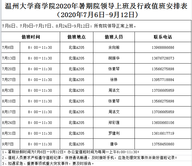 成人电影 2019-2020学年暑期值班安排表(2020年7月6日-9月12日)