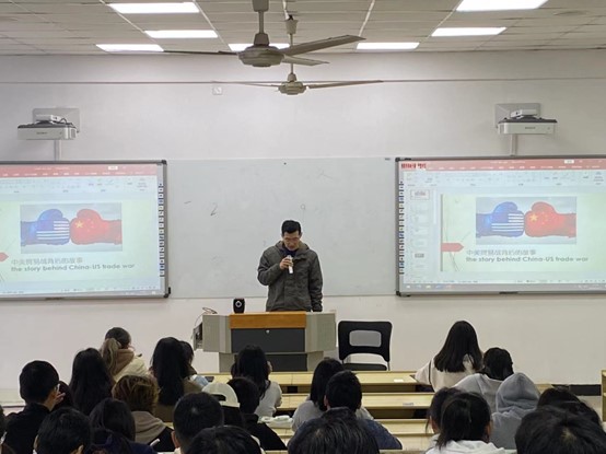 在课程的最后,姜亮老师简单介绍了中美贸易战中中国的应对之策,以“挑战不妥协,不逼战”的策略来回应美方。姜亮老师将自身工作和学习经历融入到授课过程中,讲授深入浅出、引经据典、语言幽默,为学生们带来了一次耳目一新、精彩生动的思想政治教育。