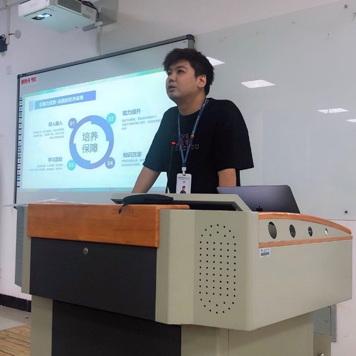 首先,字节跳动温州直营中心的郑潇捷同学为大家带来了字节跳动的基本介绍。在他的讲解下,一家年轻,活泼,追求极致的互联网公司逐渐出现在大家面前;其次,潇捷同学也为大家介绍了大众所熟知的抖音和今日头条等知名APP,他从字节跳动商业化讲起,向大家介绍了字节跳动旗下的营销品牌——巨量引擎;最后,潇捷同学为各位同学介绍了字节跳动本地直营中心这个平台,他提到,字节跳动本地直营中心始终坚持着用科技和信息服务助力千万企业成长,努力成为让越来越多的中小企业快速成长和和走遍全球的的营销平台。