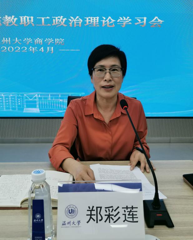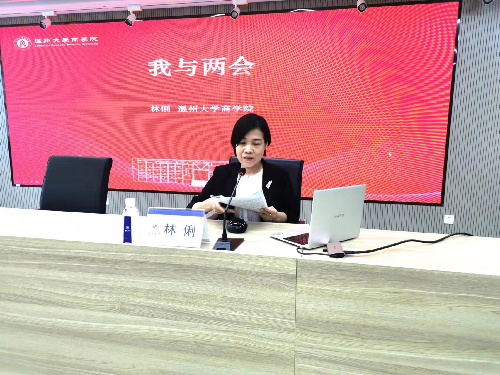 教授林俐作题为《我与两会》的报告。林俐教授传达了温州市“两会”精神,用“高度、广度、温度”三个度为大家解读2022年温州市《政府工作报告》,报告站在高质量发展建设共同富裕示范区的高度、从政治、经济、社会、文化、文明建设等五个方面的广度、以民生为本的温度全面回顾温州市“十三五”期间的工作,前瞻性展望了未来的发展,提出了“千年商港、幸福温州”的城市定位,成绩显著、振奋人心。