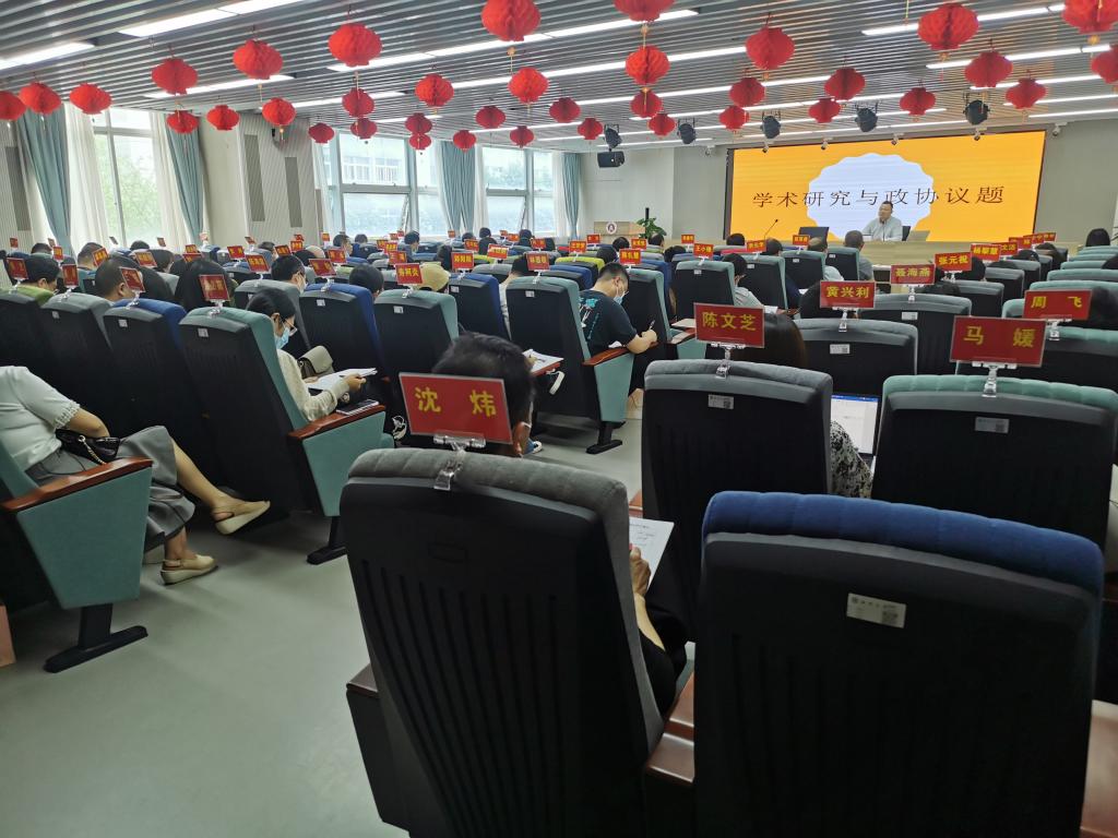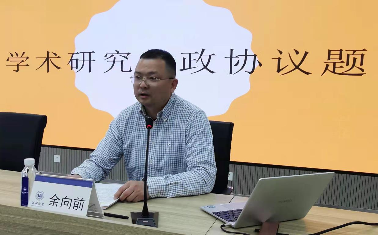 副院长余向前教授作题为《学术研究与政协议题》的报告。他从三个方面与大家交流本次的政协之履,一是介绍政协议题模板,他提出要选题好、多调研、强应用,同时要主动履职,多发言多提案,二是介绍科研与议题在时效性、严谨性、专业性方面的差异,并介绍了自己的科研课题是如何转化为政协议题的,三是为大家提出服务地方、对接温州市经济建设的几点建议。