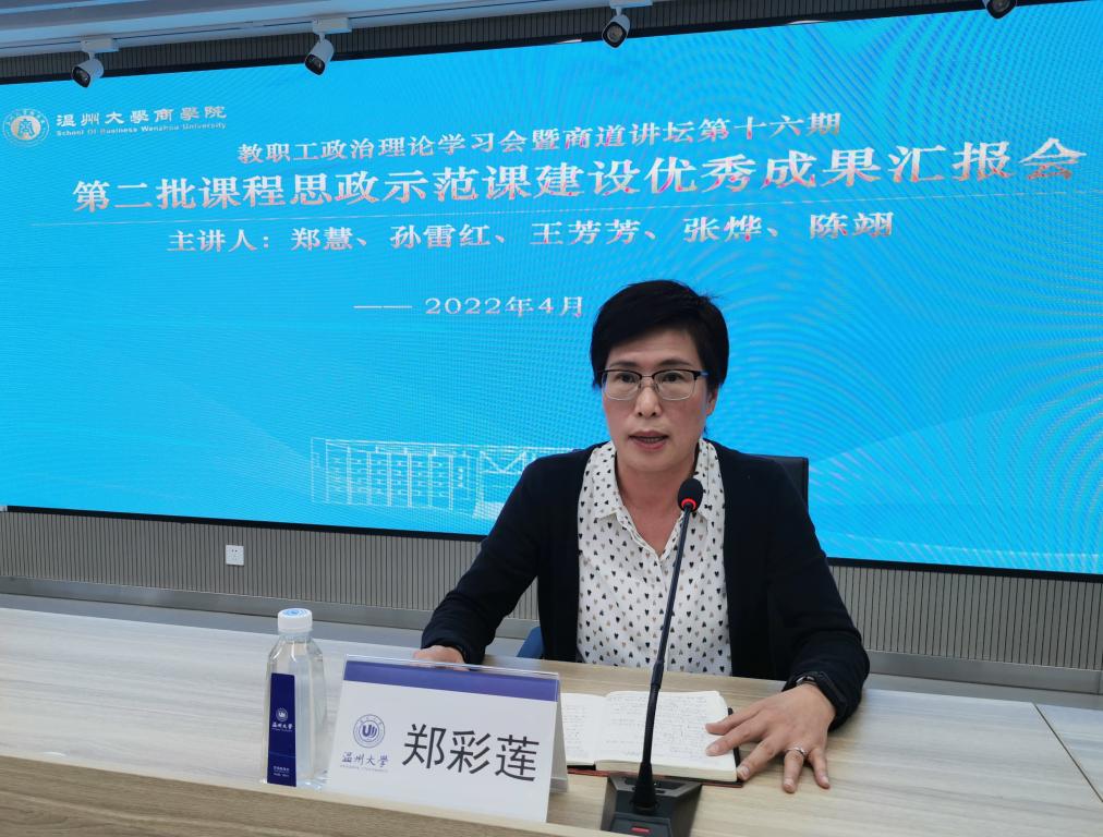 举行商道讲坛第十六期暨第二批课程思政示范课优秀建设成果汇报会,邀请郑慧、孙雷红、王芳芳、张烨、陈翊等五位老师做经验分享。会议由学院党委书记郑彩莲主持,全体教职工参会。