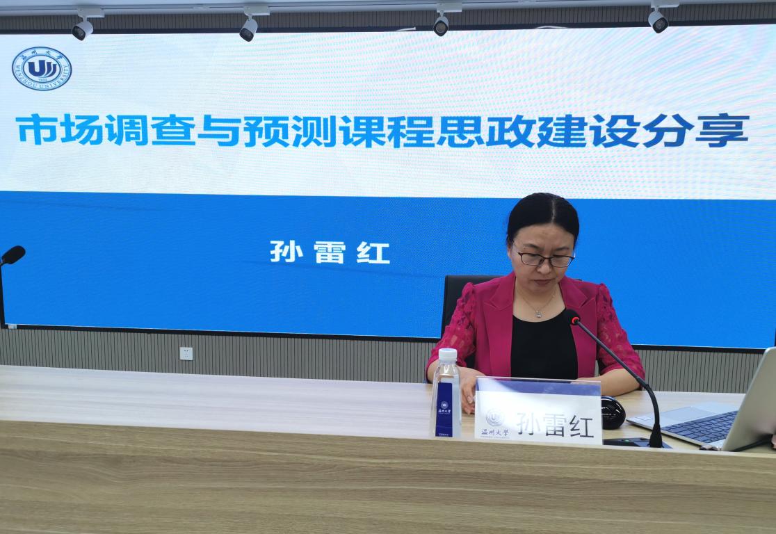 工商管理系的孙雷红老师为大家分享《市场调查与预测》课程思政建设经验。她从课程概述、教学设计、教学案例、建设成果四个方面进行分享,她提出要将专业知识与思政元素有机融合,深入挖掘教学中专业知识蕴含的思政元素,从制度认同和家国情怀、品德修养、职业规范、科学思维、专业伦理等多个层面进行价值引领,并跟学科竞赛相结合,以赛促学发挥实践育人功效,同时运用线上线下混合式教学,培养学生自主学习、独立思考的能力和科学思维,潜移默化地实现知识与价值观相统一。
