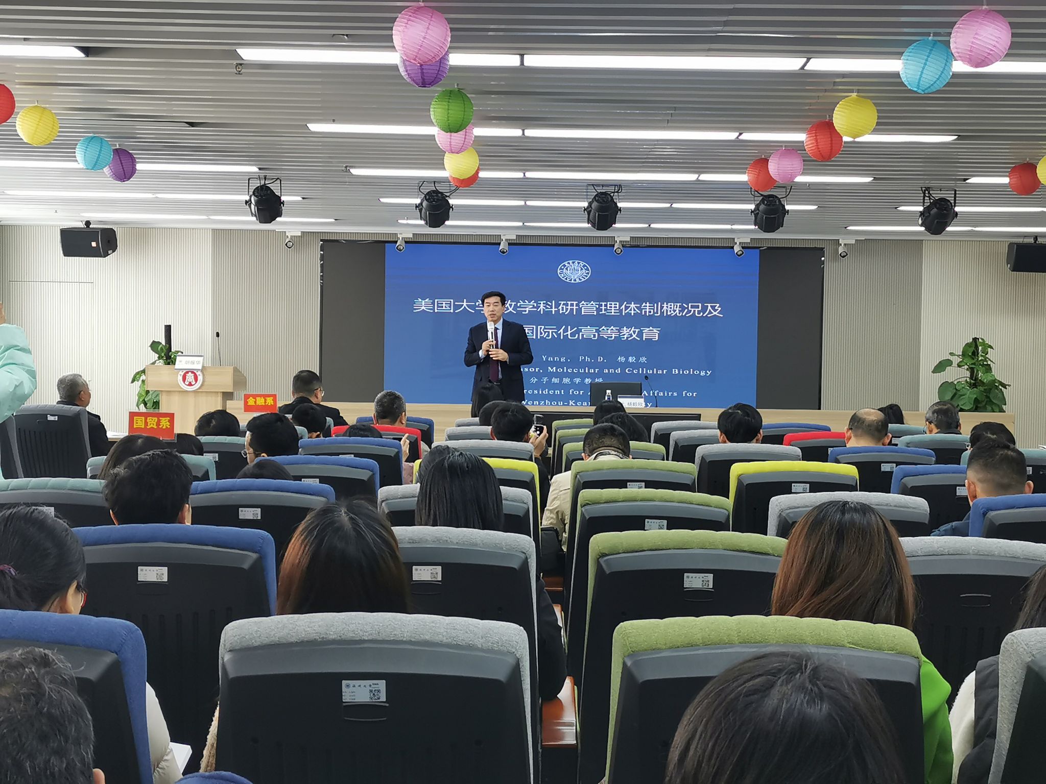 杨毅欣教授作题为“美国大学教学科研管理体制概况及国际化高等教育”的专题讲座。他介绍了美国大学的类别、美国高校的体制特点、科研特点、教学特点、学生特点、终生教规制、学校对教师的评价体系等,并从这几个方面探讨了中美大学教学科研管理体制的异同点。他分享了自己在美国的教学科研经历,并结合自身经历详细讲述了美国大学教师招聘面试流程、教师续聘流程、评聘终生教授等美国大学教学科研管理体制特点。在国际化教育方面,他介绍了美国大学的课程设置和学生培养特点和中美合作办学的温州肯恩大学办学思路,并就博雅教育、X型学生培养、交叉学科学习等方面与大家进行探讨。