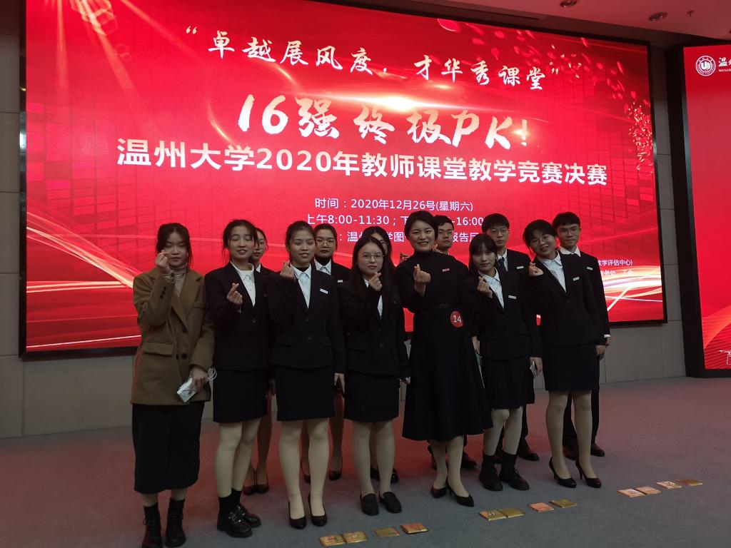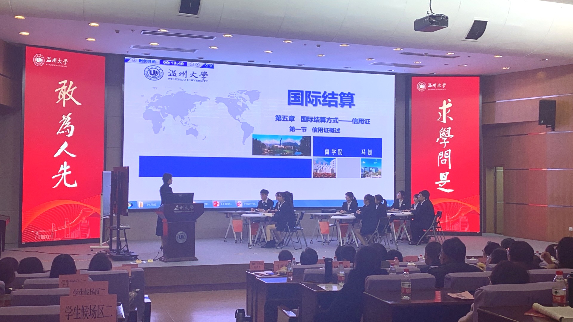 26日的决赛盛大而隆重。学校领导高度重视,校党委书记谢树华、校长赵敏、校党委副书记吴金法、副校长徐和昆等都莅临现场观摩。马媛老师下午第4个出场,她采用信用证业务的基本当事人为基础进行学生分组角色定位,课堂教学中跌宕起伏,张弛有度;采用启发式教学,引发学生思考;利用新冠疫情下温州企业的案例,向学生展示国际贸易的行为规则,培养学生对外贸易能力和圆梦贸易强国的情怀。18国贸的12位同学在课堂上表现突出,认真思考,积极参与课堂互动。马媛老师的表现充分展示了我院教师的风采,也赢得了现场观众的热烈掌声。
