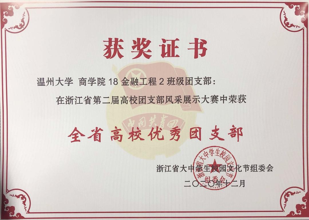 浙江省第二届高校团支部风采大赛落下帷幕,我院18金融工程2班团支部荣获全省高校优秀团支部的荣誉称号。