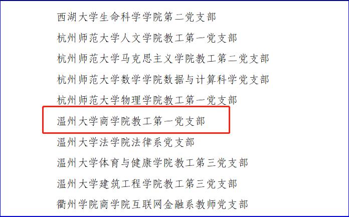 多年来,支部以创建全省和全国党建工作样板支部为目标,夯实基础、凝练特色、突显品牌,在“思想建党、制度治党、组织强党、凝聚力向党”四个层面协同发力,为温州经济社会发展贡献了温大的金融力量,成功获评第二批浙江省党建工作样板支部培育创建单位,并获第三批全国党建工作样板支部参评资格。