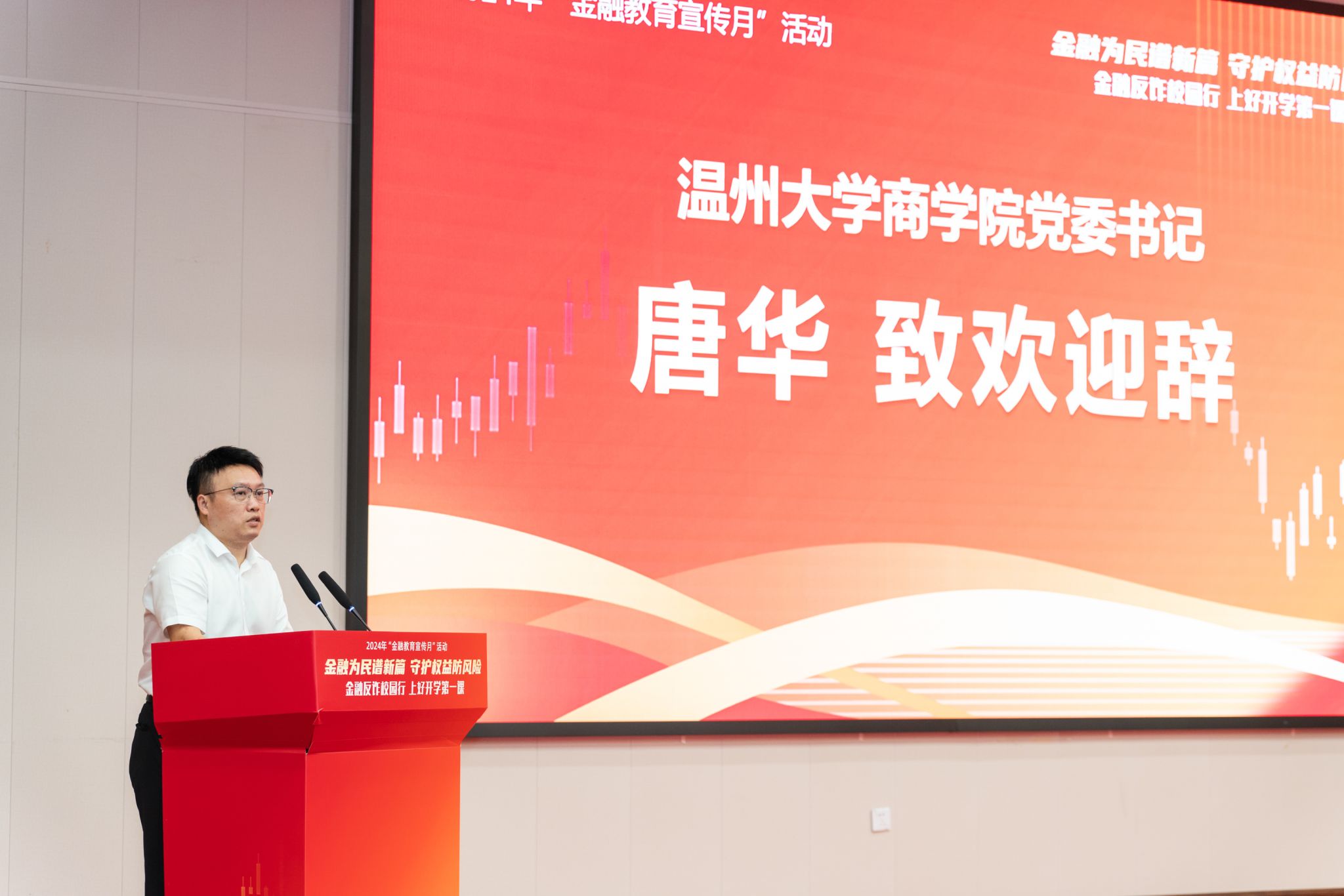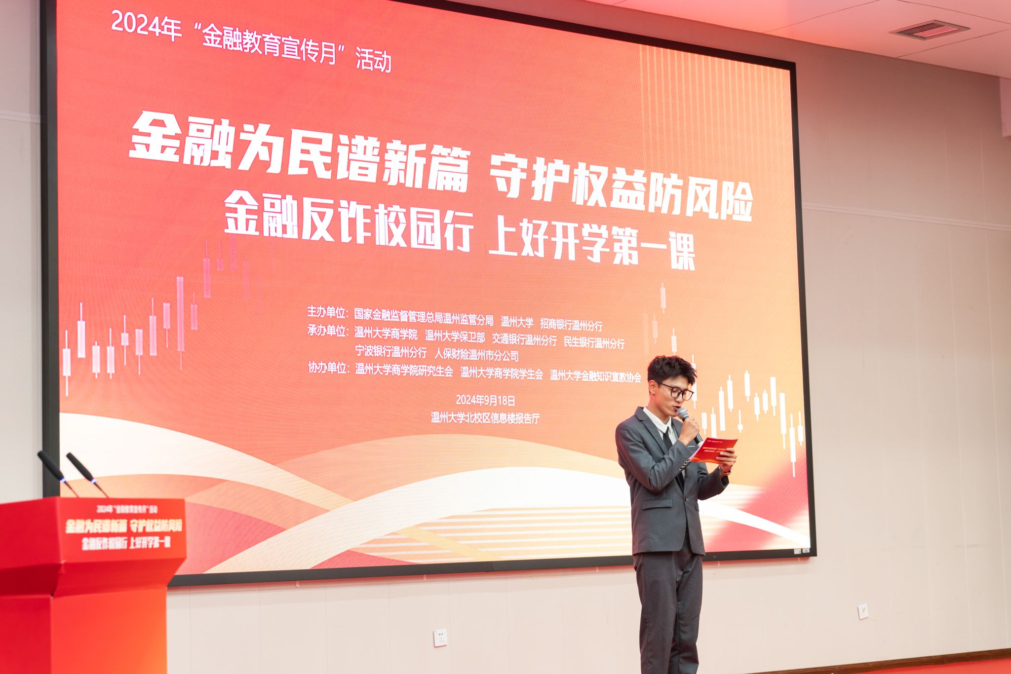 国家金融监督管理总局温州监管分局局长朱燕军详细介绍了金融知识进校园活动的目的和工作要求,强调了金融教育的重要性,并对如何有效进行金融知识普及提出了明确要求。他勉励大学生要努力学好各类金融知识,通过自己的所学所得去影响身边人,去改变社会群体因金融知识匮乏而被骗的现状,共同守护好人民群众的“钱袋子”。