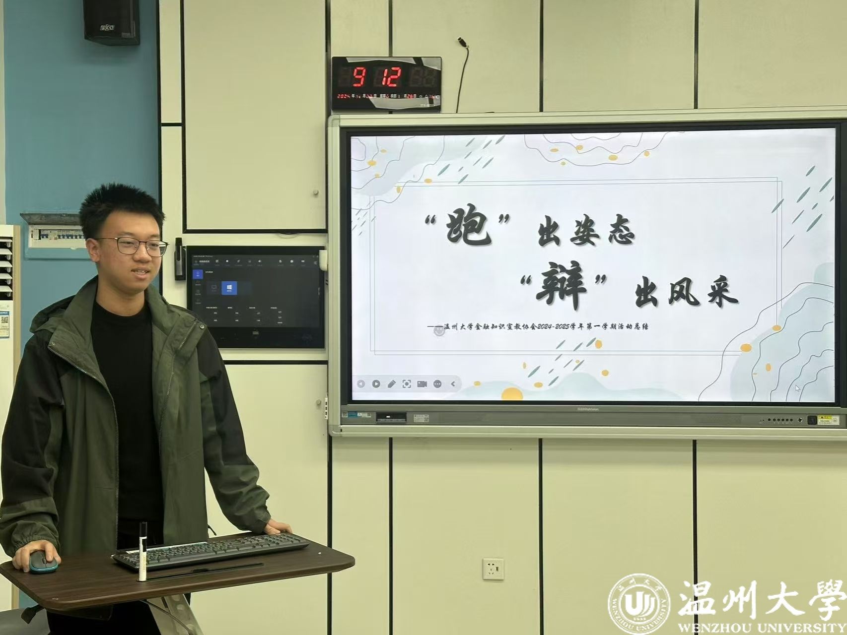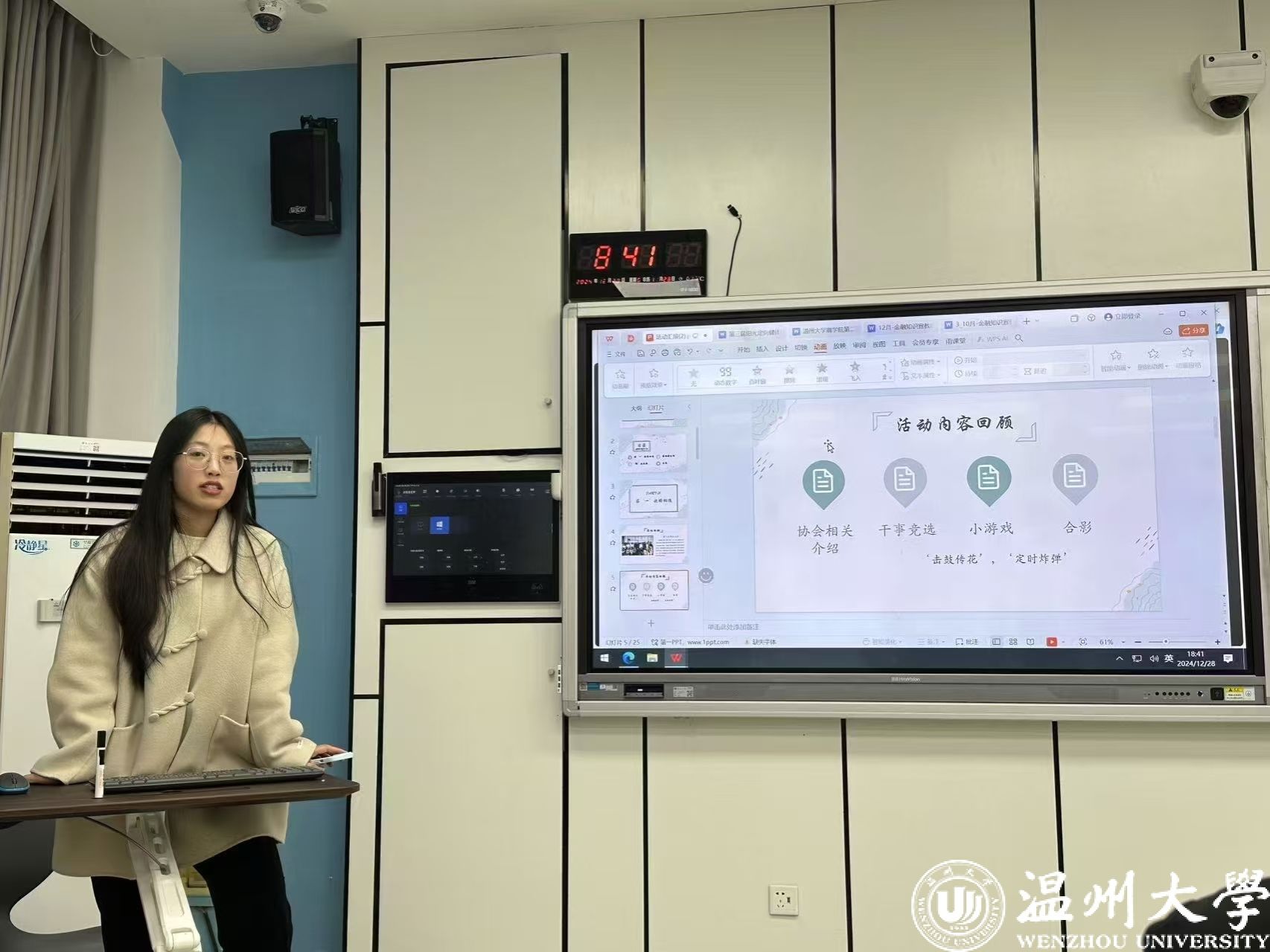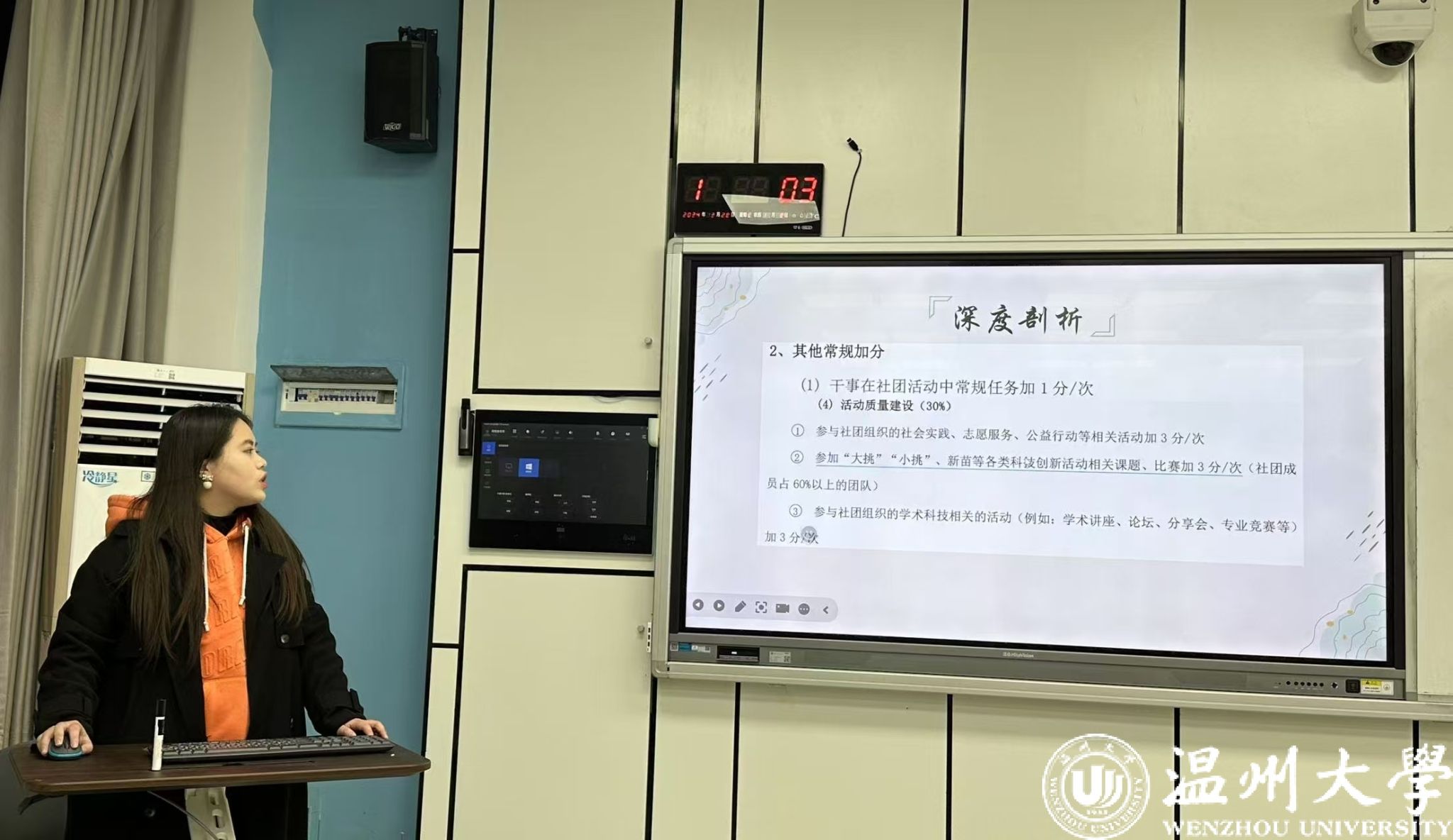 宣传部部长金姝伶同学大家展示了协会成员积分情况逐一讲解积分的来源与获得以此激发社员们的积极性,形成“比学赶超”的良好氛围