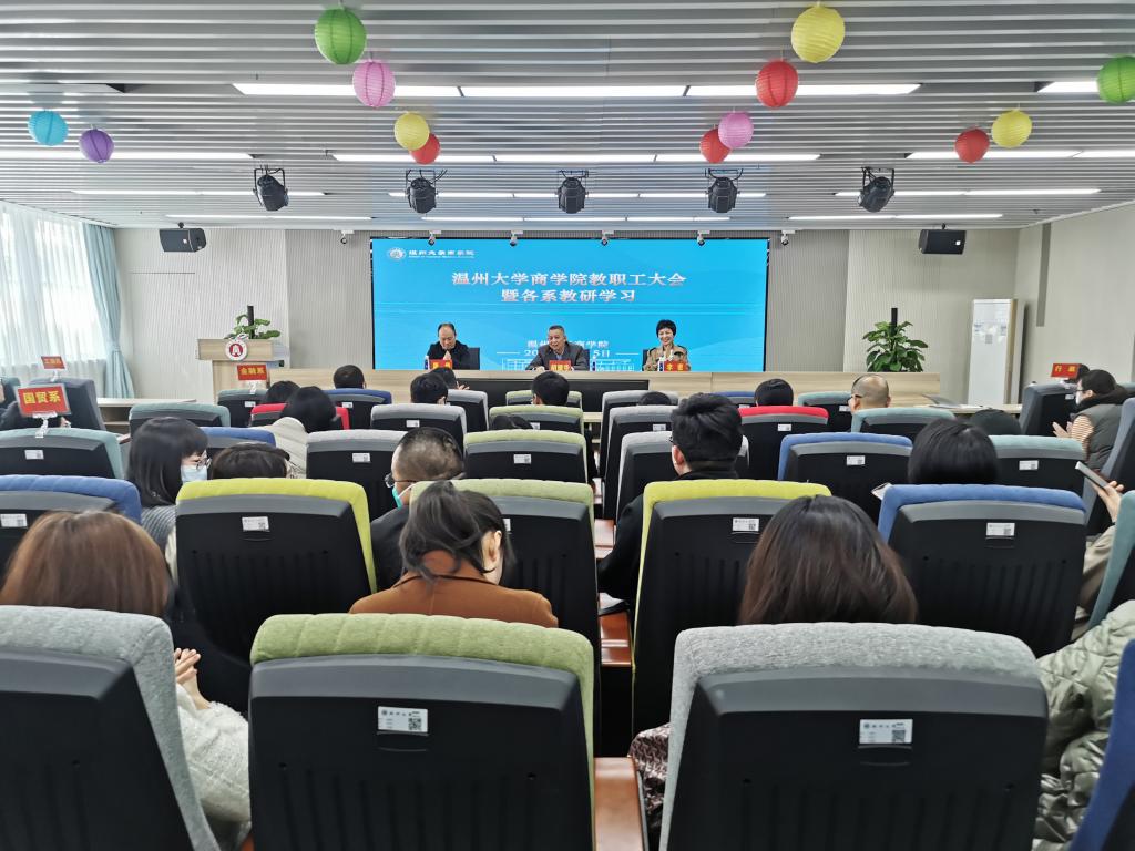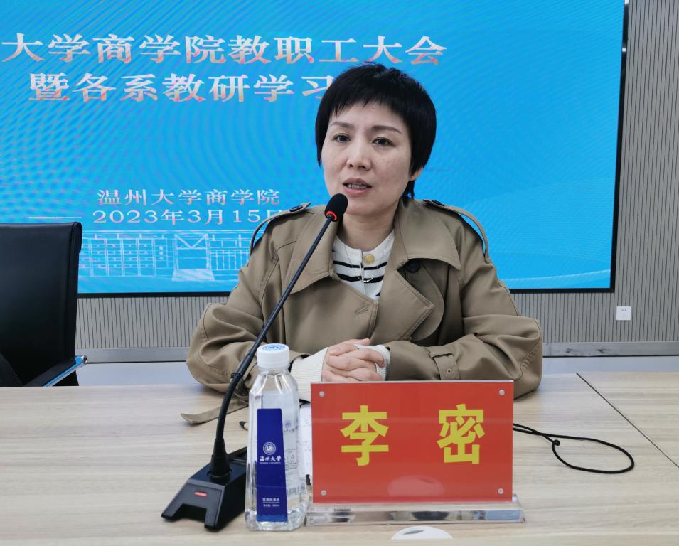 在商院楼A226仲辉商道讲堂举行全院教职工大会暨政治理论学习会。全体教职工参加会议,会议由学院党委书记李密主持。