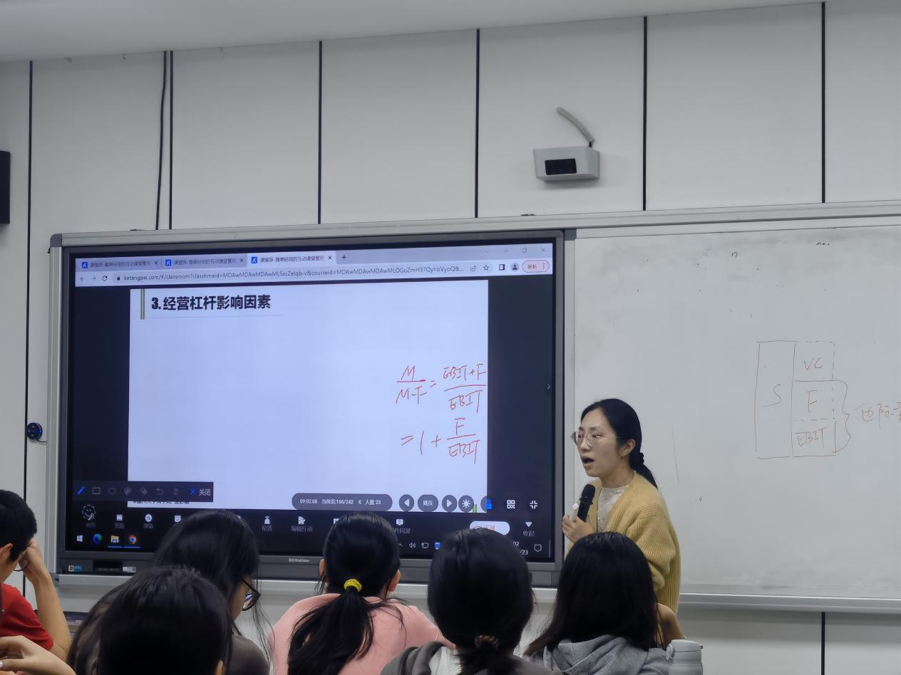 金必简老师本次授课的主题是杠杆专题。从阿基米德的“给我一个支点我能翘起地球”引入,谈论企业财务活动中存在的杠杆现象,通过案例结合问题链条引导学生认识经营杠杆、财务杠杆和联合杠杆以及它们的测算模型和影响因素。授课过程衔接顺利,教学内容丰富,重点突出,学生互动良好。
