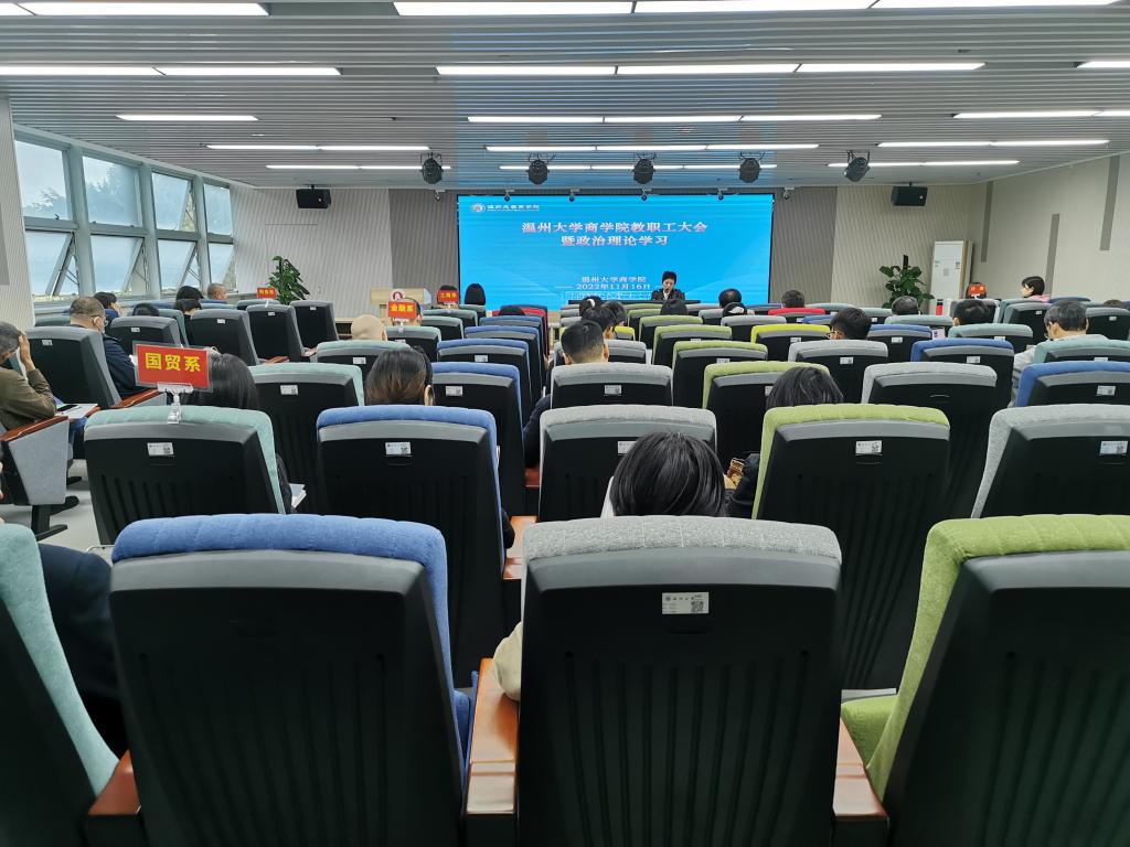 在商院楼A226仲辉商道讲堂举行全院教职工大会暨政治理论学习会。会议由学院党委书记李密主持。