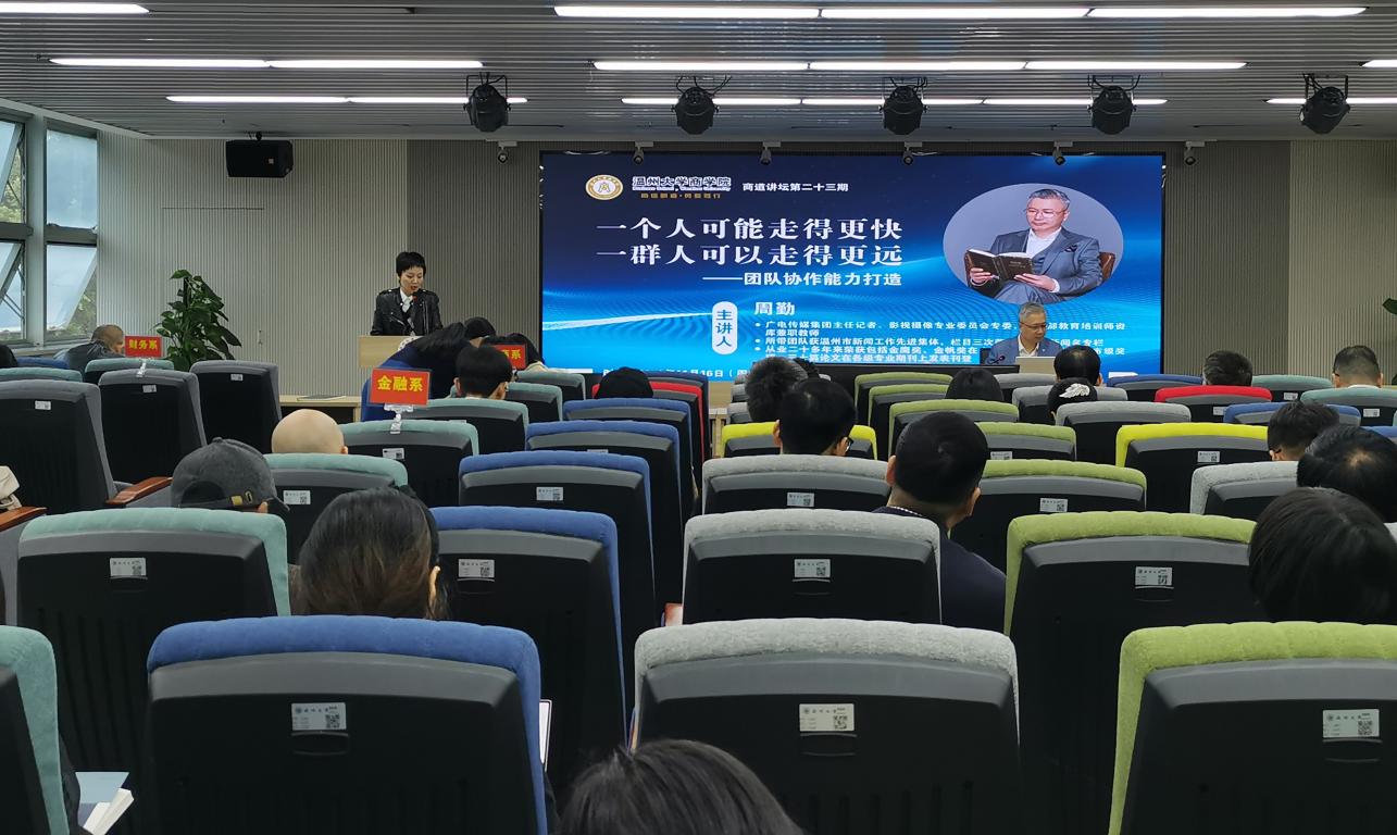 会议邀请了广电传媒集团主任记者、影视摄像专业委员会专委、市干部教育培训师资库兼职教师周勤为大家作商道讲坛第二十三讲——题为《一个人可能走得更快,一群人可以走得更远——团队协作能力打造》的专题讲座。