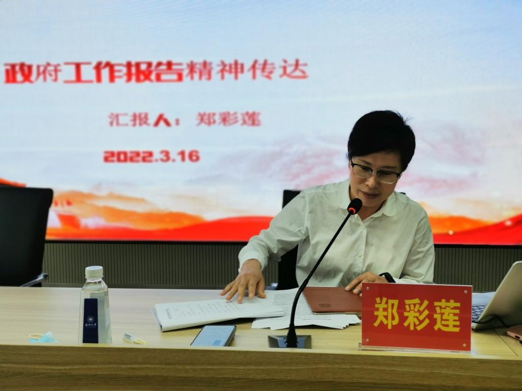 郑彩莲书记传达贯彻全国两会精神。她介绍了今年两会的重要背景、重要意义、重要议程。郑彩莲书记指出2022年全国两会的胜利召开具有非凡意义,习近平总书记在全国两会期间发表了重要讲话,提出了一系列新理念、新要求、新任务,同时今年两会对教育领域十分关注,对高等教育提出了更高的要求。她强调,一,要提高政治站位,老师们要学深学透全国两会精神。二,结合学校学院2022主题主线,对标对表,狠抓工作落实。三,统筹协调,科学有序安排各项工作。尤其要做好当下的研究生复试工作、疫情防控与发展“两手抓,两战赢”的工作,切实推动成人电影