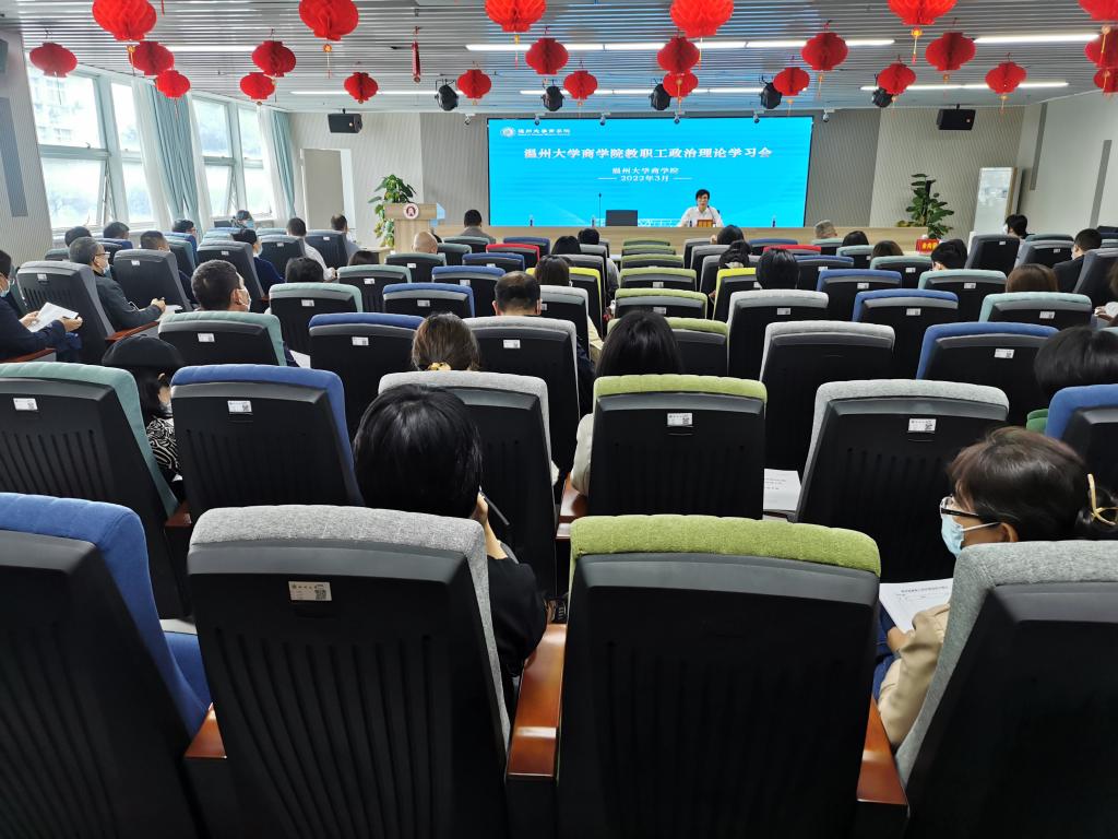 在商院楼A226仲辉商道讲堂召开全体教职工理论学习大会。全体教职工参加学习会,学院党委书记郑彩莲主持会议。