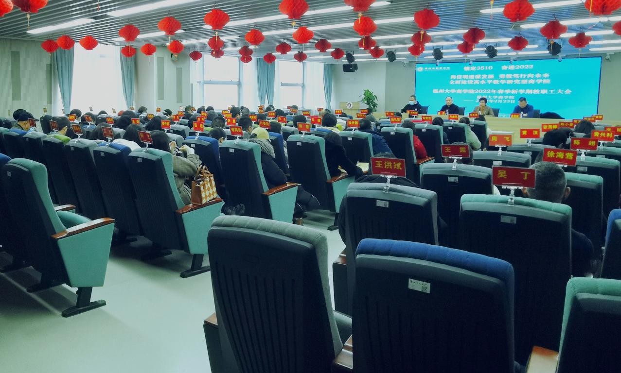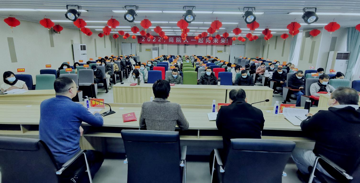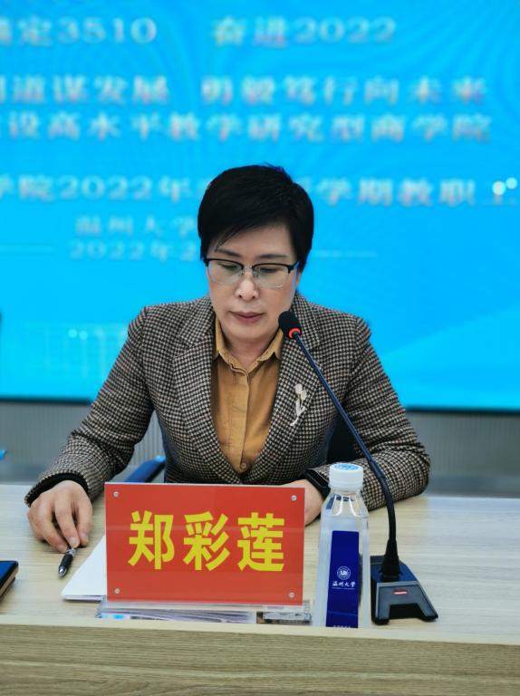 在商院楼A226仲辉商道讲堂召开2022年春季新学期教职工大会,为新学期工作谋篇布局。会议由学院党委书记郑彩莲主持。