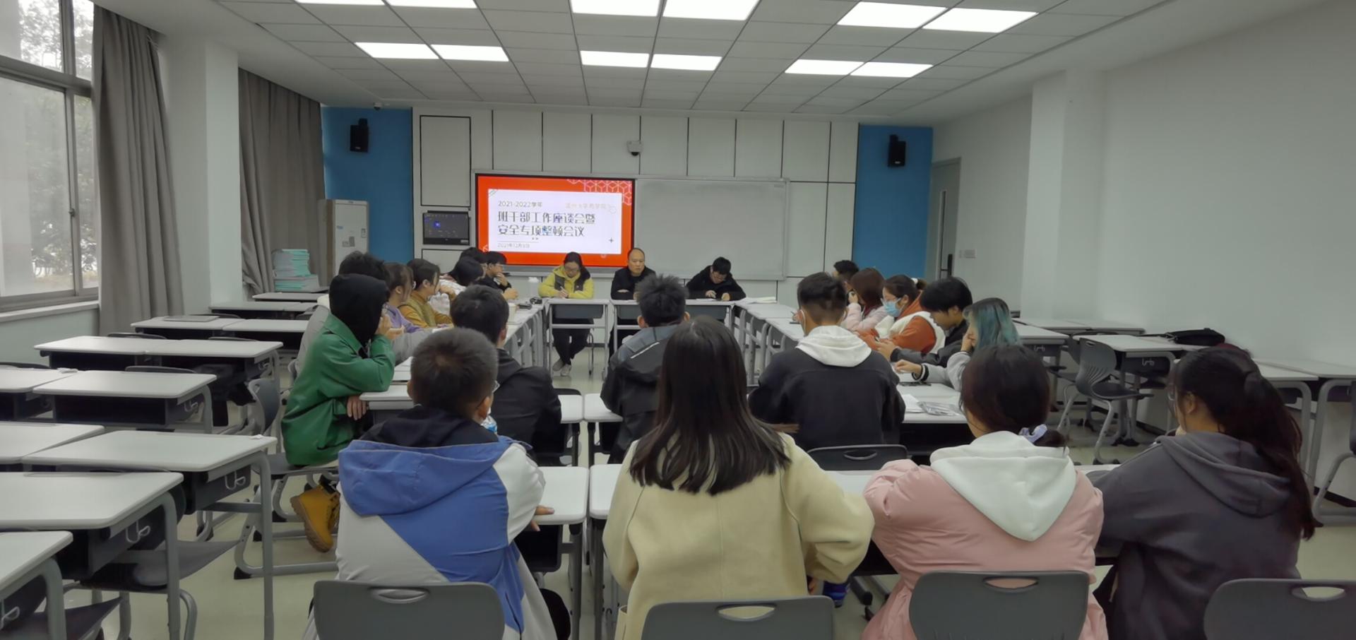 召开班干部工作座谈会暨安全专项整顿会议,学院党委副书记唐华、学工办副主任周洁文、全体辅导员参会,本、研各班班长出席会议。