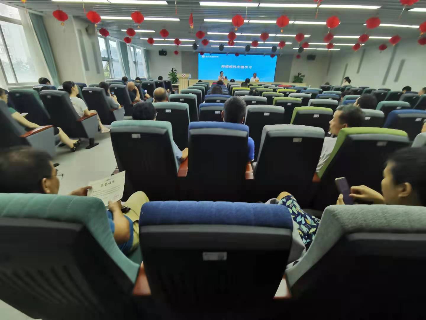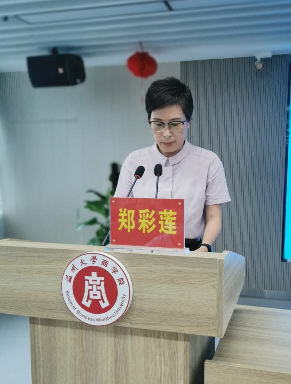 在信息楼A226仲辉商道讲堂召开师德师风学习专题会议,全体教职工参加会议。会议由学院党委书记郑彩莲主持。