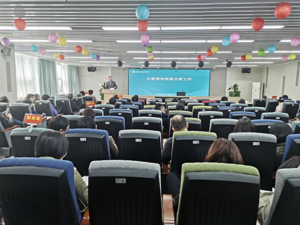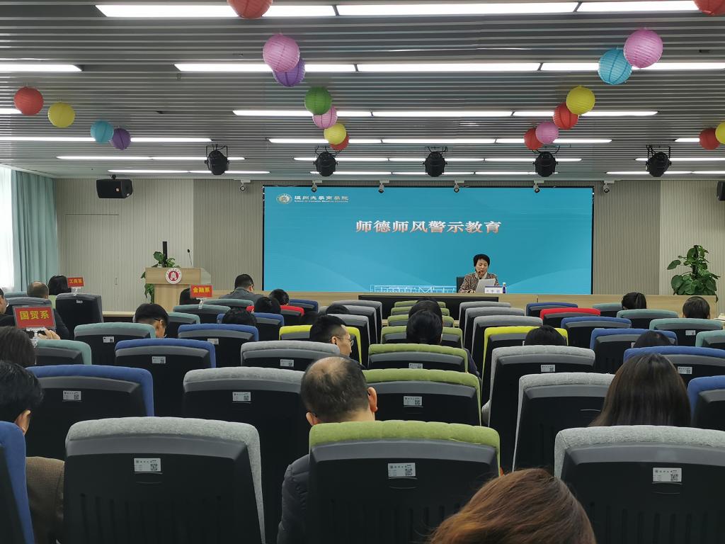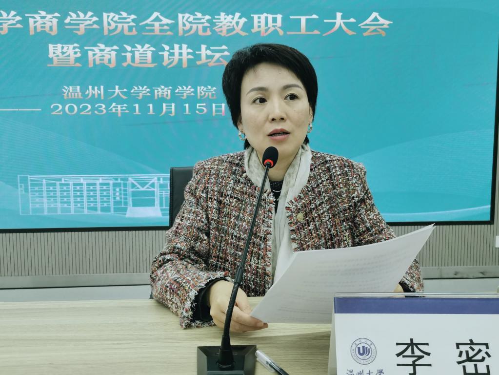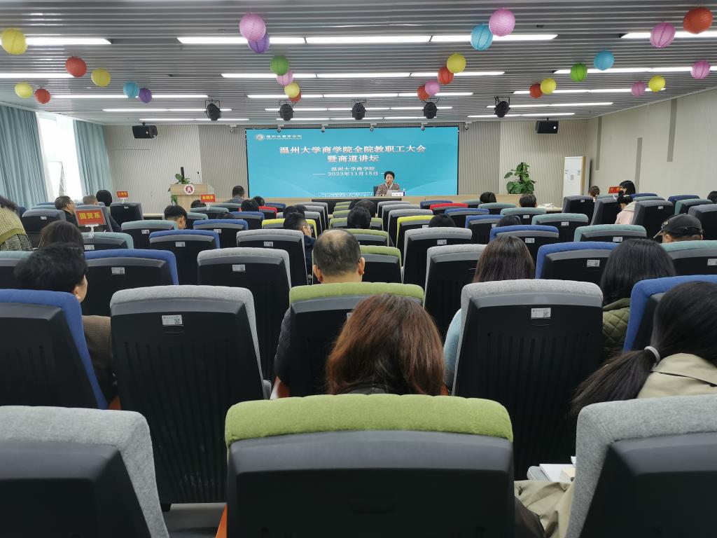 在仲辉商道讲堂举行全院教职工大会,全体教职工参加会议,会议由学院党委书记李密主持。